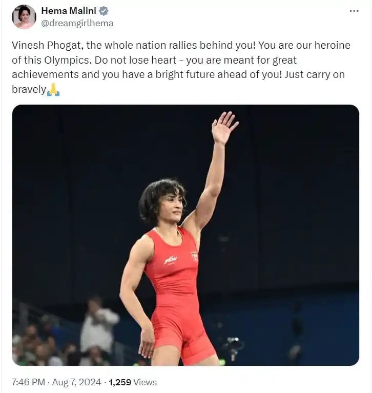 ଅଗଷ୍ଟ ୭ ତାରିଖ ସନ୍ଧ୍ଯ଼ାରେ ହେମା ମାଳିନୀ ସୋସିଆଲ ମିଡିଆରେ ଟ୍ରୋଲ୍ ମଧ୍ଯରେ ଏକ ଟ୍ୱିଟ୍ ସେଯ଼ାର କରିଥିଲେ। ଯେଉଁଠାରେ ସେ ଭିନେଶ ଫୋଗାଟଙ୍କୁ ପ୍ରଶଂସା କରିଥିଲେ ଏବଂ ଉତ୍ସାହିତ କରିଥିଲେ। ଅଭିନେତ୍ରୀ କହିଲେ, “ଭିନେଶ ଫୋଗଟ୍, ପୂରା ଦେଶ ଆପଣଙ୍କ ସହିତ ଅଛି! ଆପଣମାନେ ହେଉଛନ୍ତି ଏହି ଅଲିମ୍ପିକ୍ସର ଆମର ହିରୋ। ହାର ମାନନ୍ତୁ ନାହିଁ-ଆପଣ ମହାନ ସଫଳତା ପାଇଁ ତିଆରି ହୋଇଛନ୍ତି ଏବଂ ଏକ ଉଜ୍ଜ୍ୱଳ ଭବିଷ୍ଯତ ଅଛି! କେବଳ ସାହସର ସହିତ ଆଗକୁ ବଢ଼ନ୍ତୁ “।
