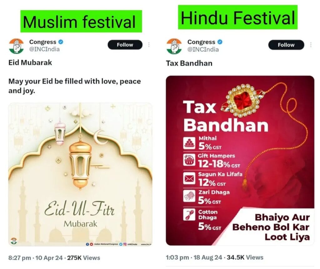 କଂଗ୍ରେସ ଦଳ ସୋସିଆଲ ମିଡିଆ ପ୍ଲାଟଫର୍ମ ଏକ୍ସରେ ରକ୍ଷା ବନ୍ଧନ ବିଷୟରେ ଏକ ପୋଷ୍ଟ କରିଛି। ଏହି ପୋଷ୍ଟରେ କଂଗ୍ରେସ ଲେଖିଛି, ଟିକସ ବନ୍ଧନ-ମିଠା ଉପରେ ୫ ପ୍ରତିଶତ ଜିଏସଟି, <ଆଇଡି1 ରେ ଉପହାର, , ଜରି ସୂତା ୫ ପ୍ରତିଶତ ଏବଂ ସୂତା ସୂତା ୫ ପ୍ରତିଶତ। ଭାଇ ଓ ଭଉଣୀମାନେ, କହିବାକୁ ଗଲେ, ଏହି ସରକାର ଲୁଟ୍ କରିଛି।