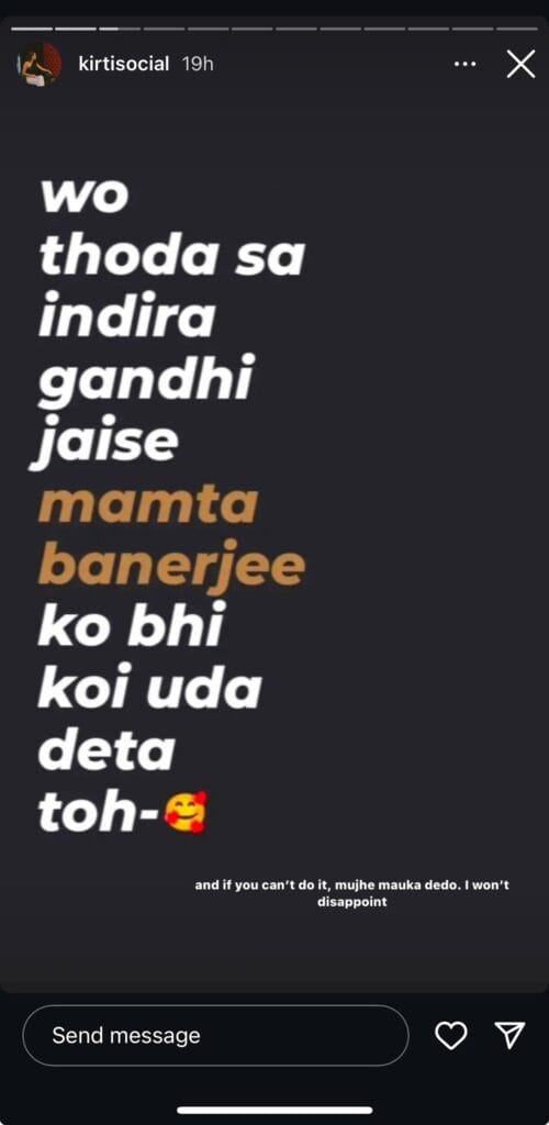 ମିଳିଥିବା ସୂଚନା ଅନୁଯାୟୀ, ଇନଷ୍ଟାଗ୍ରାମରେ ଏଭଳି ପୋଷ୍ଟ କରିଥିବା ଝିଅର ନାମ ହେଉଛି କୀର୍ତ୍ତି ଶର୍ମା। ସେ ଇନଷ୍ଟାଗ୍ରାମରେ ‘କୀର୍ତିସୋସିଆଲ “ନାମକ ଏକ ହ୍ୟାଣ୍ଡେଲ ଚଳାଉଛନ୍ତି। ରିପୋର୍ଟ ଅନୁଯାୟୀ, ସେ ଦେଶର ପୂର୍ବତନ ପ୍ରଧାନମନ୍ତ୍ରୀ ଇନ୍ଦିରା ଗାନ୍ଧୀଙ୍କ ପରି ମୁଖ୍ଯମନ୍ତ୍ରୀଙ୍କୁ ହତ୍ୟା କରିବାକୁ ଲୋକଙ୍କୁ ଉସୁକାଇଥିବା ଅଭିଯୋଗ ହୋଇଛି। ରିପୋର୍ଟ ଅନୁଯାୟୀ, ମହିଳା ଜଣକ ପୋଷ୍ଟ କରିଥିଲେ, “ଇନ୍ଦିରା ଗାନ୍ଧୀଙ୍କ ପରି ମମତା ବାନାର୍ଜୀଙ୍କୁ ଗୁଳି କର।” ଯଦି ଆପଣ ଏହା କରିପାରିବେ ନାହିଁ, ତେବେ ମୁଁ ଆପଣଙ୍କୁ ନିରାଶ କରିବି ନାହିଁ।
