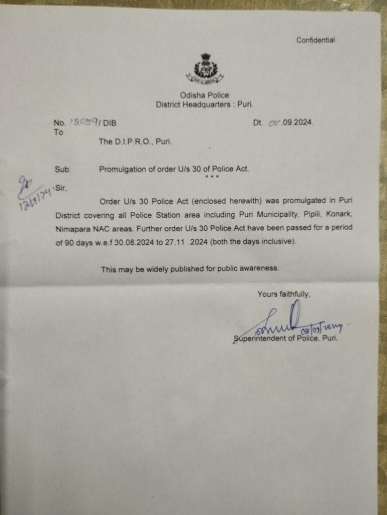 ପୁରୀ (ରିପୋର୍ଟ – ସମୀର ରଞ୍ଜନ ନାୟକ ): ପୋଲିସ ଆଇନର ୩୦ ଧାରା ପୁରୀ ଜିଲ୍ଲାରେ ଲାଗୁ କରାଯାଇଛି।ଏହା ଅଗଷ୍ଟ ୩୦ ତାରିଖ ଠାରୁ ନଭେମ୍ବର ୨୭ ତାରିଖ ୯୦ ଦିନ ପର୍ଯ୍ୟନ୍ତ।